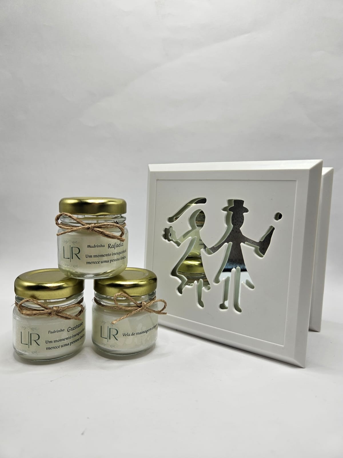 Incluso no valor: 1 caixa - 3 mini vela aromatica - 1 adesivo frente - Laço rami